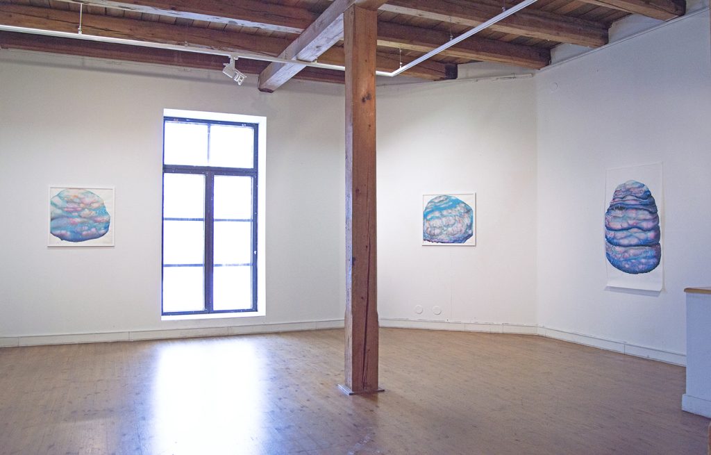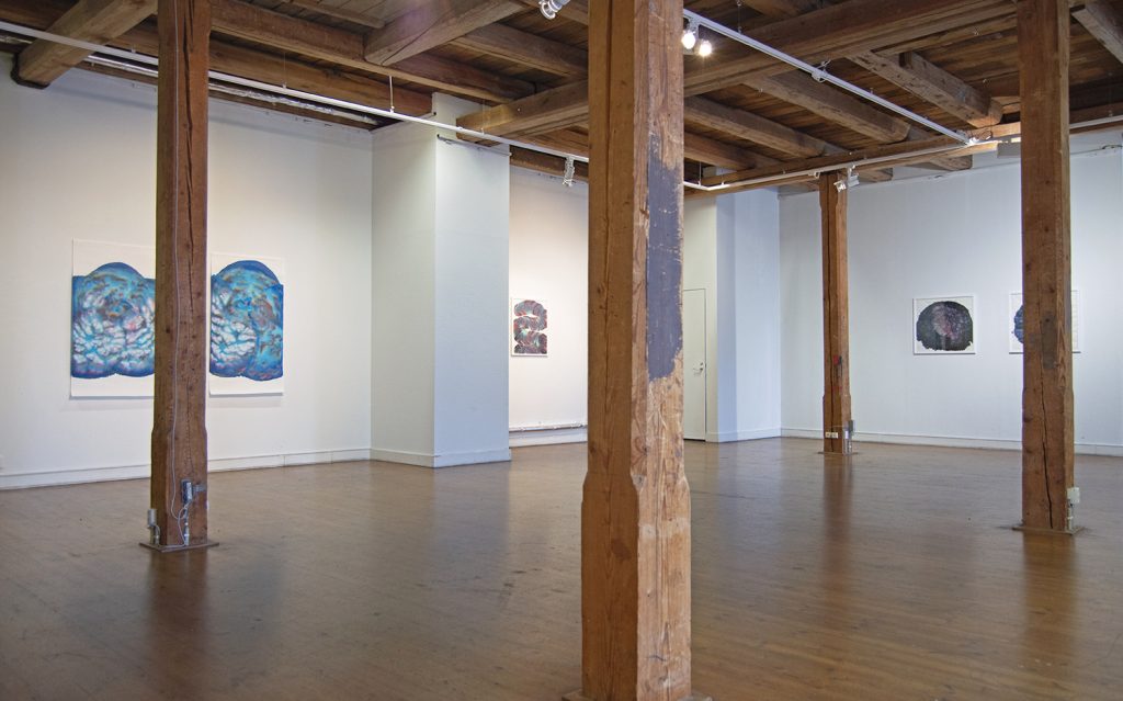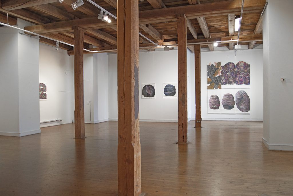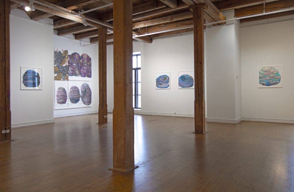 A centripetal force makes a body follow a curved path. It affects the movements of the mass, the orbits of the planets and the creation of all living things. The watercolor and oil paintings featured in the exhibition contain modular formations based on natural shapes. The cyclic motion gives them their shape and reflections on the wet surface give them their colors. Paint and the themes of the paintings are linked by states of spreading, mixing and differentiation. Brush strokes expand on the paper into still frames of liquid formations.